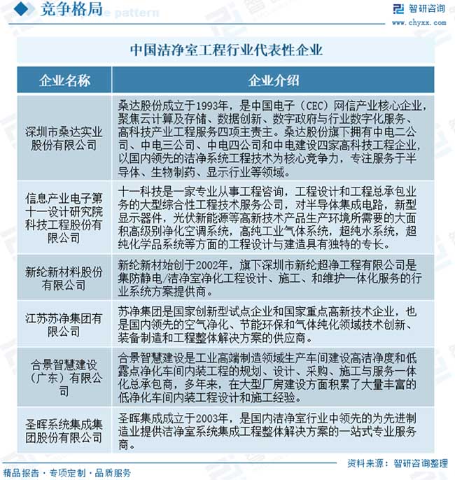 超潔凈環(huán)境控制又融合了風(fēng)險(xiǎn)評(píng)估、生產(chǎn)認(rèn)證的概念和程序,加之潔凈技術(shù)跨行業(yè)、跨專業(yè)、跨學(xué)科的特點(diǎn),使得潔凈室工程的難度和復(fù)雜性增加。因此對(duì)于潔凈室工程行業(yè)來(lái)說(shuō),優(yōu)化設(shè)計(jì)、現(xiàn)場(chǎng)施工環(huán)境的協(xié)調(diào)與管控、工程相關(guān)技術(shù)細(xì)節(jié)的經(jīng)驗(yàn)積累,對(duì)客戶需求的理解和實(shí)現(xiàn),以及對(duì)設(shè)計(jì)變更的準(zhǔn)備和響應(yīng)程度等都是衡量潔凈室工程企業(yè)競(jìng)爭(zhēng)能力的重要指標(biāo)。?目前,我國(guó)潔凈室工程行業(yè)競(jìng)爭(zhēng)較為激烈,企業(yè)數(shù)量較多。其中,桑達(dá)股份、十一科技、蘇凈集團(tuán)、新綸新材、柏誠(chéng)股份、亞翔集成等設(shè)計(jì)研究院或建設(shè)承包企業(yè)在降低建造成本、提高潔凈室的穩(wěn)定性等方面占據(jù)優(yōu)勢(shì),能提供高端潔凈室系統(tǒng)集成解決方案,位居行業(yè)領(lǐng)先地位。同時(shí),行業(yè)內(nèi)還存在大量規(guī)模較小、技術(shù)水平與綜合解決方案能力有限的潔凈室工程企業(yè),普遍集中在對(duì)潔凈等級(jí)要求不高的低端市場(chǎng)。